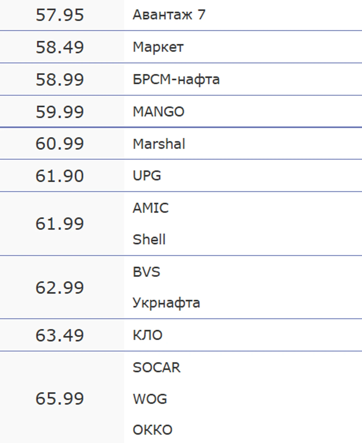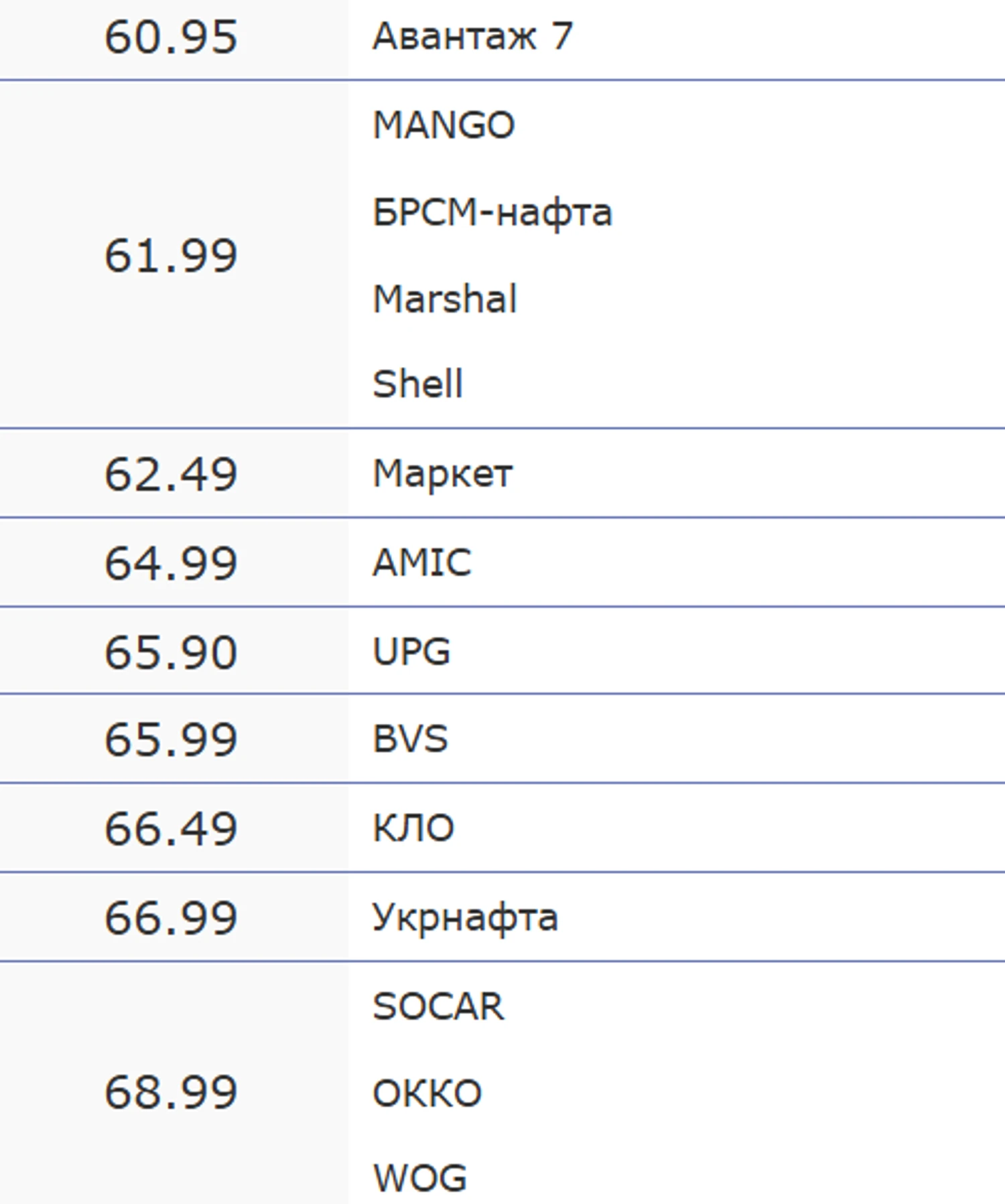 Немного дешевле обойдется автомобилистам заправить машину топливом А-95. За это придется заплатить от 60,95 грн/литр на заправках Авантаж 7 до 66,99 грн/литр, если заправляться на АЗС "Укрнафта". Дороже всего выйдет купить литр 95-го на заправках сетей SOCAR, OKKO и WOG – там просят 68,99 грн.