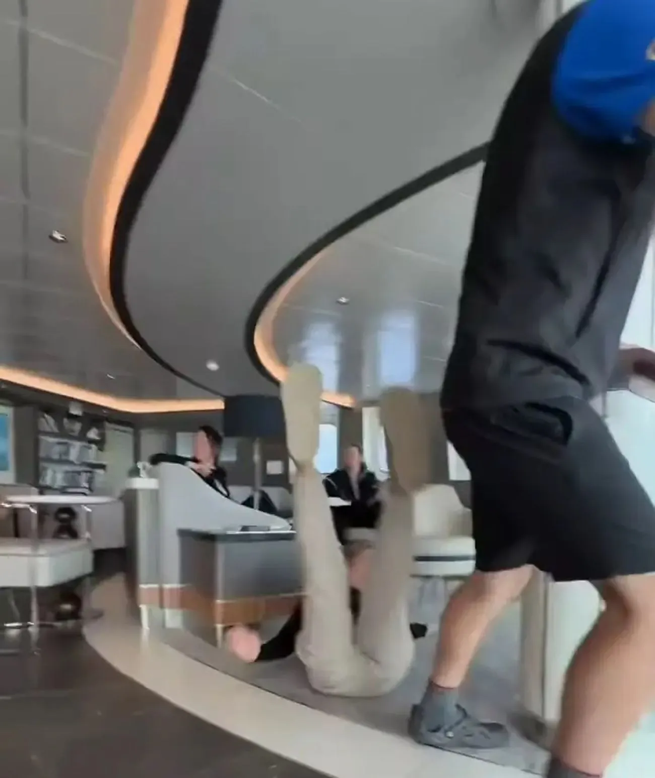 На видео видно, как гигантские волны разбиваются о панорамные окна, а пассажиры пытаются устоять на ногах.