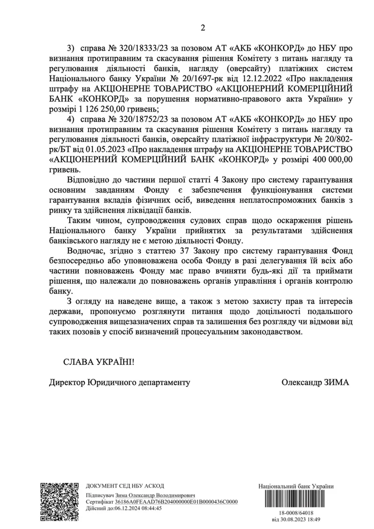 Уголовное производство № 62023100110000229 против главного юриста НБУ Государственное бюро расследований открыло в конце 2023 года из-за возможного злоупотребления властью или служебным положением, повлекшего тяжкие последствия. Зима, который одновременно является председателем административного совета Фонда гарантирования вкладов физических лиц, вмешался в судебные процессы путем направления письма от имени Национального банка Украины в Фонд. В письме он "рекомендовал" отозвать иски, поданные против Нацбанка. Стоит отметить, что главный юрист регулятора просил отозвать иски банка "Конкорд", поданные еще до старта процесса его ликвидации. Истец в суде планировал оспорить штрафы на сумму почти 63,5 миллиона гривен, наложенные регулятором.