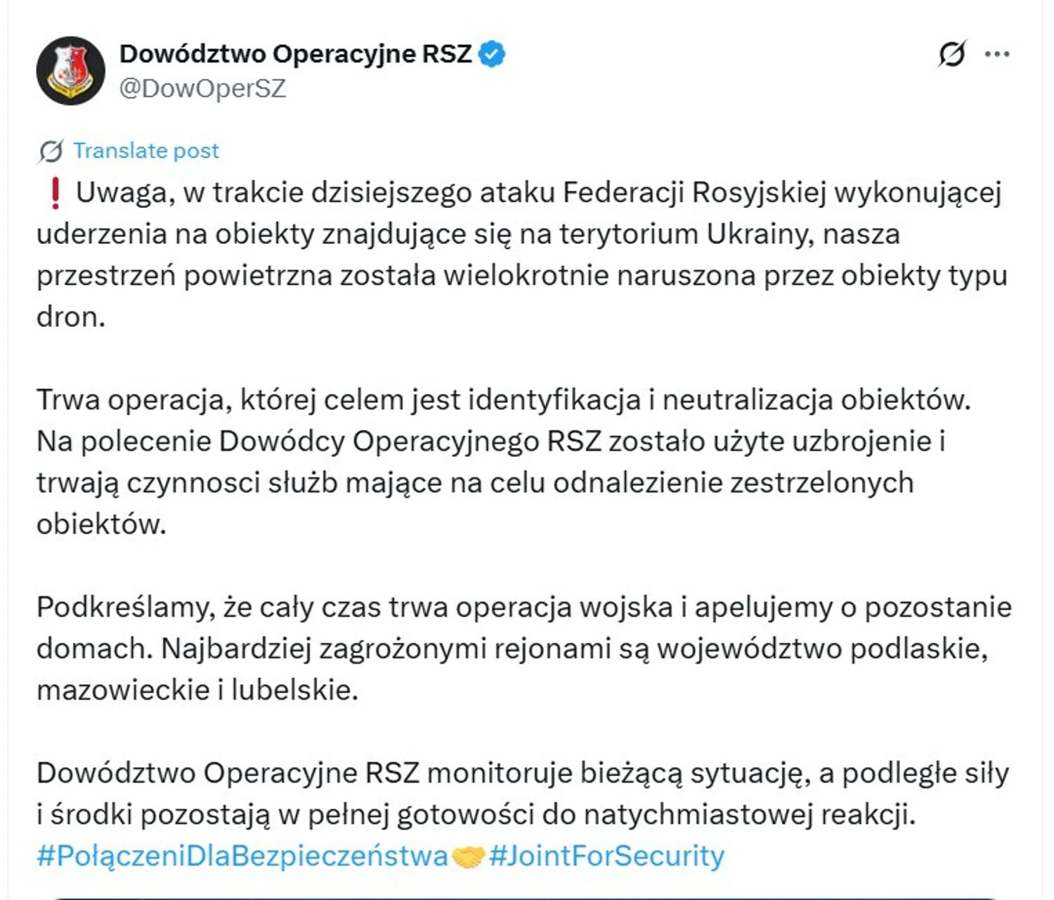 Оперативное командование ВС Польши подтвердило нарушение воздушного пространства страны российскими дронами 10 сентября. Продолжается операция по идентификации и нейтрализации объектов, задействовано вооружение.
