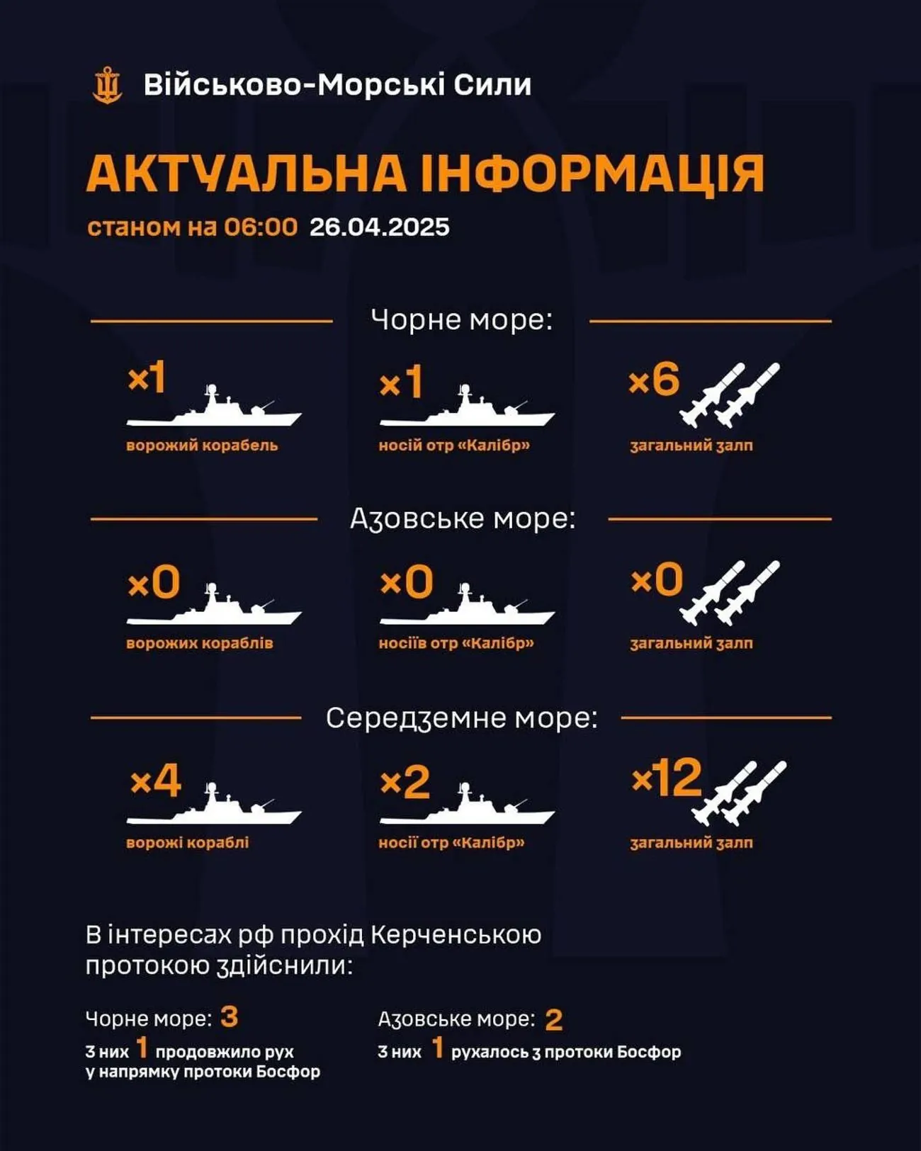 Отмечается, что по состоянию на 06:00 26.04.2025 в Черном море зафиксирован вражеский корабль, являющийся носителем крылатых ракет типа "Калибр" с общим залпом до 6 ракет. В Средиземном море также продолжается дежурство российских ракетоносцев.