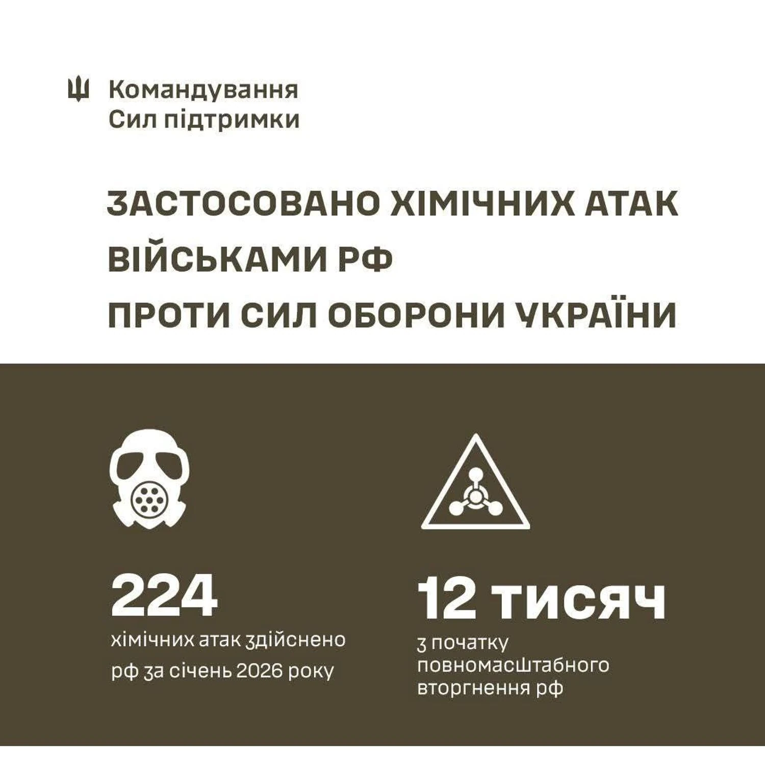 российские оккупанты 224 раза применили опасные химические вещества в январе 2026 года, преимущественно газовые гранаты К-51 и РГ-ВО. С начала полномасштабной агрессии зафиксировано более 12 тысяч таких случаев.