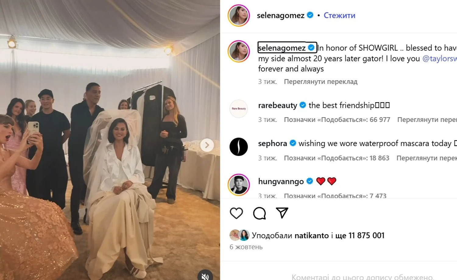 В начале октября Селена Гомес опубликовала видео со своей свадьбы, где Тейлор Свифт делает ей комплимент. Пост посвящен 12-му студийному альбому Тейлор Свифт.