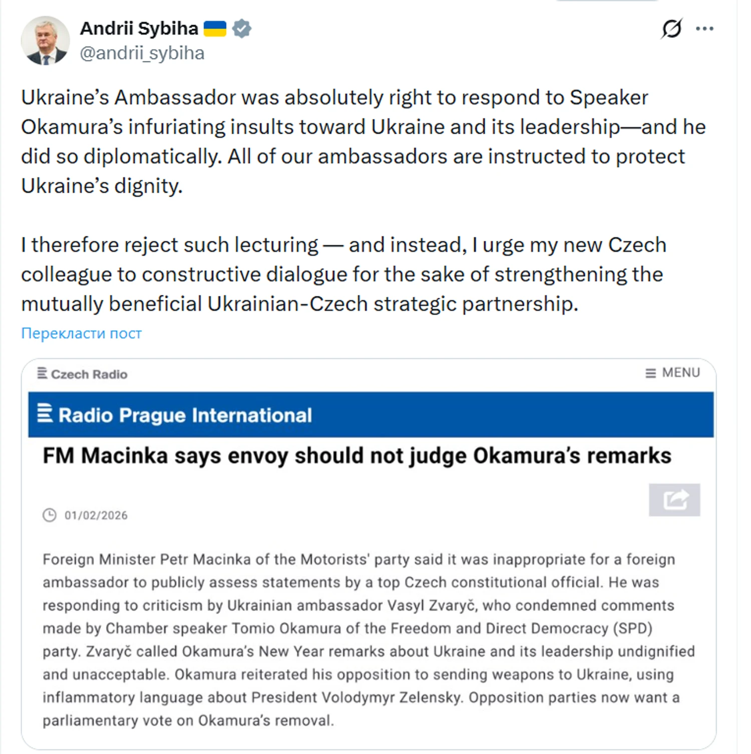 Глава МИД Андрей Сибига поддержал посла Украины после критики со стороны МИД Чехии, назвав действия дипломата профессиональными и обоснованными. Сибига подчеркнул, что реакция посла была ответом на неприемлемые выпады в адрес Украины.