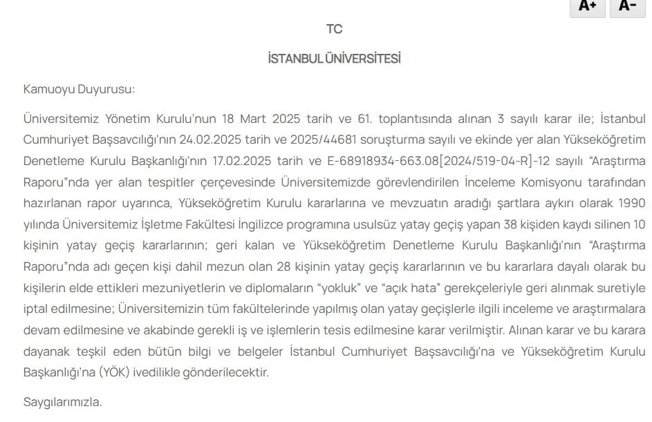Следует отметить, что отзыв степени Имаоглу не имеет последствий для его права выполнять свои полномочия мэра.