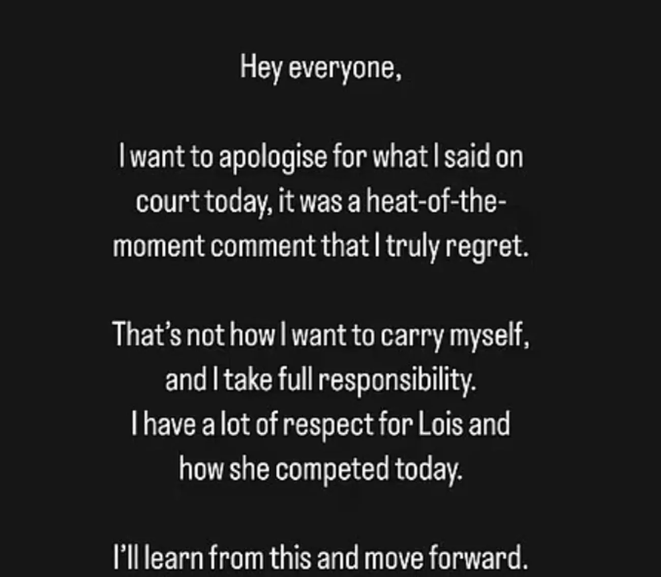 После матча 110-я ракетка мира отреагировала с заявлением в Instagram, в котором объяснила, что это был спонтанный комментарий, о котором она "очень сожалеет".