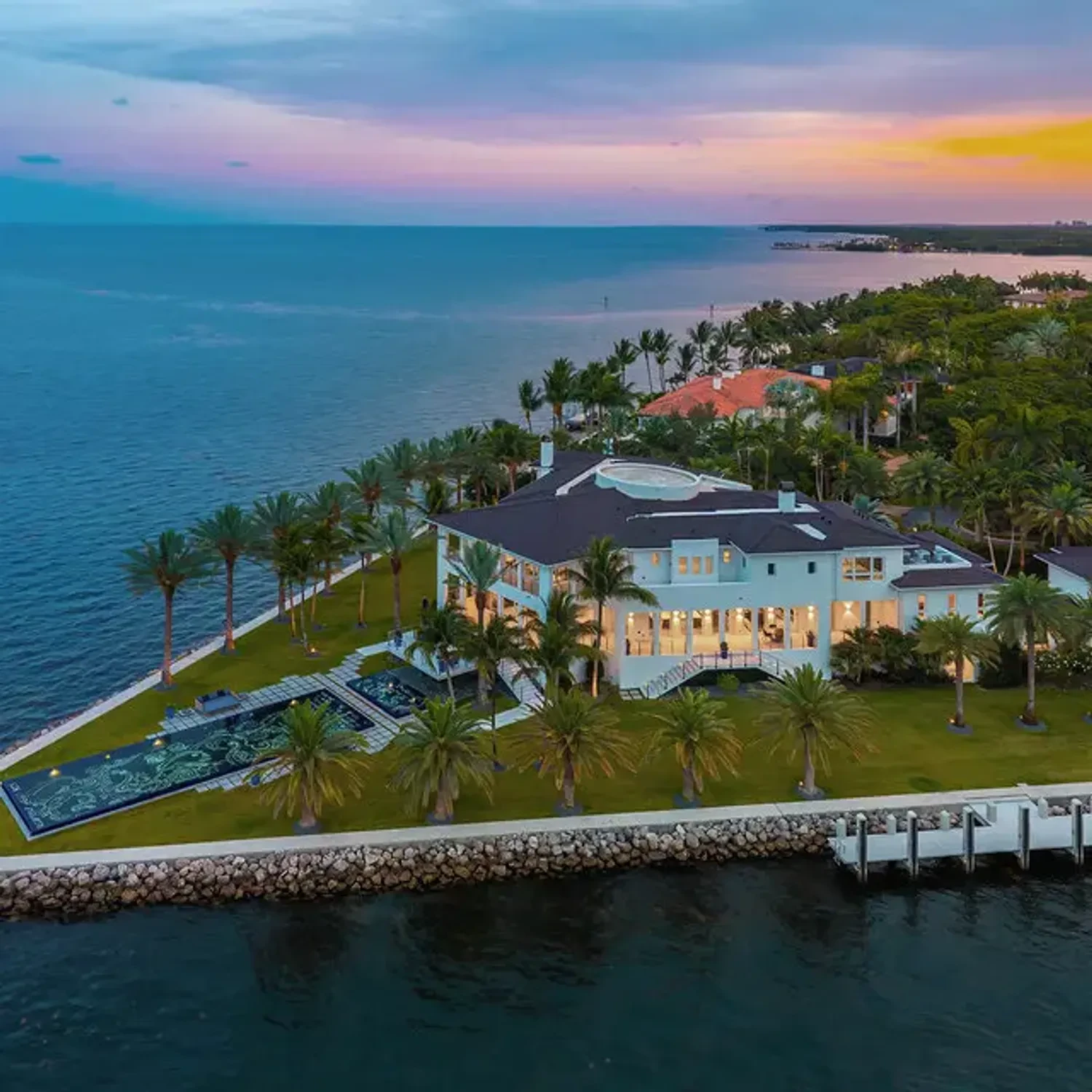 Особняк площадью почти 19 000 квадратных футов (1765 кв. м) с восемью спальнями, девятью ванными комнатами и двумя туалетными комнатами расположен на полуострове площадью 1,24 акра (0,5 га) с панорамным видом на залив Бискейн и горизонт Майами. В стоимость входят частный причал размером с яхту, открытый бассейн длиной 62 фута (до 19 м) и гараж на пять автомобилей.