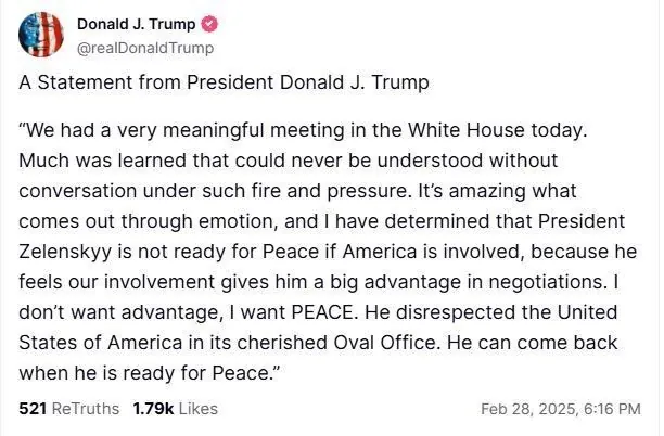 Сегодня у нас была очень содержательная встреча в Белом доме. Под таким огнем и давлением узнали многое, чего невозможно понять без разговора. Удивительно то, что проявляется через эмоции, и я решил, что президент Зеленский не готов к миру, если в нем будет задействована Америка, потому что он чувствует, что наше участие дает ему большое преимущество в переговорах. Я не хочу преимуществ, я хочу мира