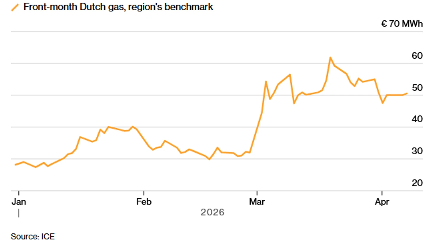 Фьючерсы на нидерландский газовый бенчмарк с поставкой в ближайший месяц к 10:52 утра в Амстердаме торговались на 1% дешевле, на уровне 49,52 евро за мегаватт-час.