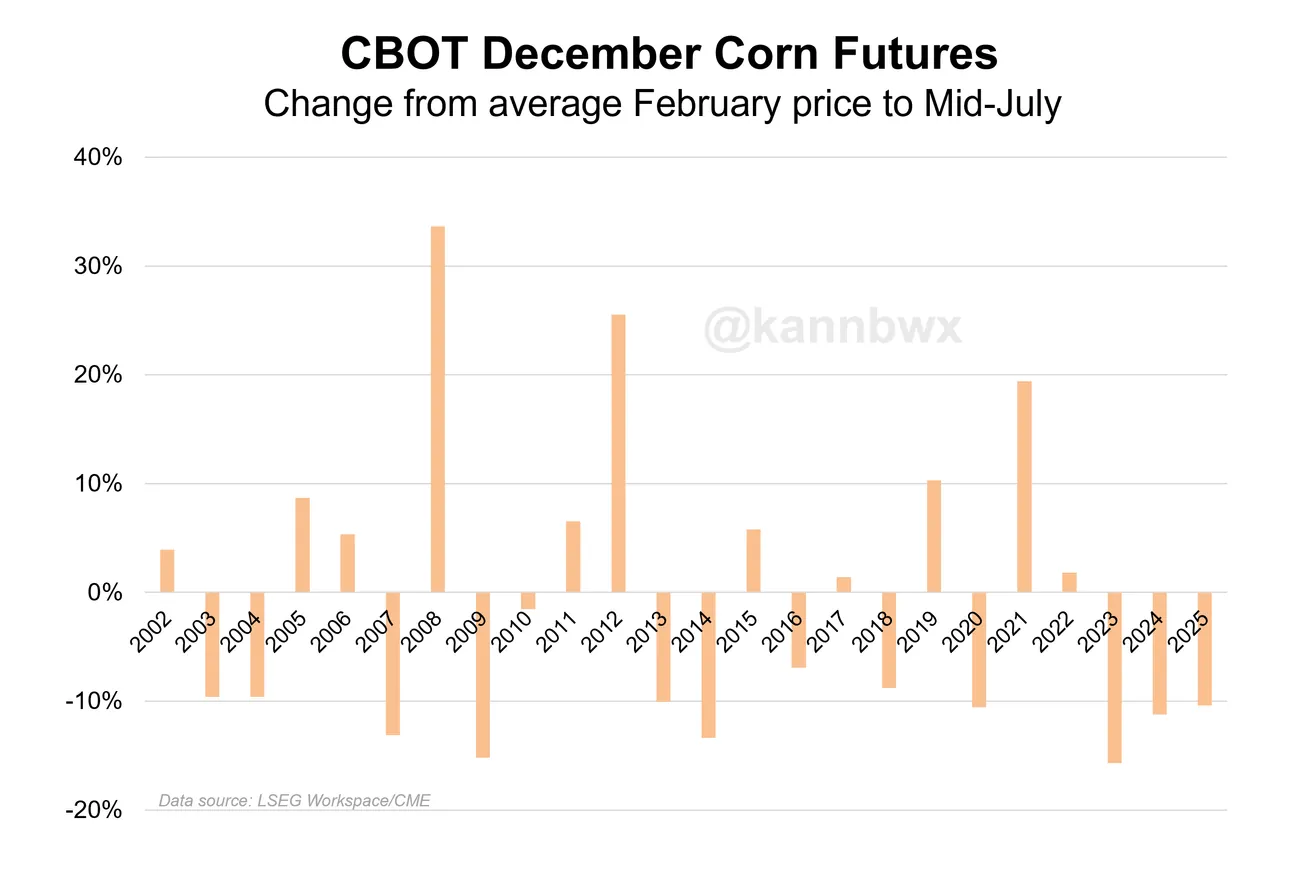 Однако с тех пор снижение цен не было чем-то из ряда вон выходящим, что может стать неблагоприятным фактором для оптимистичных спекулянтов. Декабрьская кукуруза в этом месяце торгуется на 10% ниже средней цены февраля, что меньше, чем за два предыдущих года.