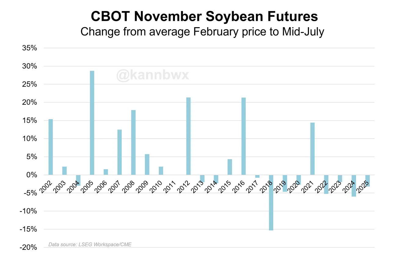 С 2006 года было девять июльских периодов, когда номинальные цены на соевые бобы были ниже скользящего среднего значения этого месяца, составлявшего 10,20 доллара. После корректировки это снова самый низкий показатель с 2006 года (9,74 доллара за бушель; номинальная цена 6,15 доллара).