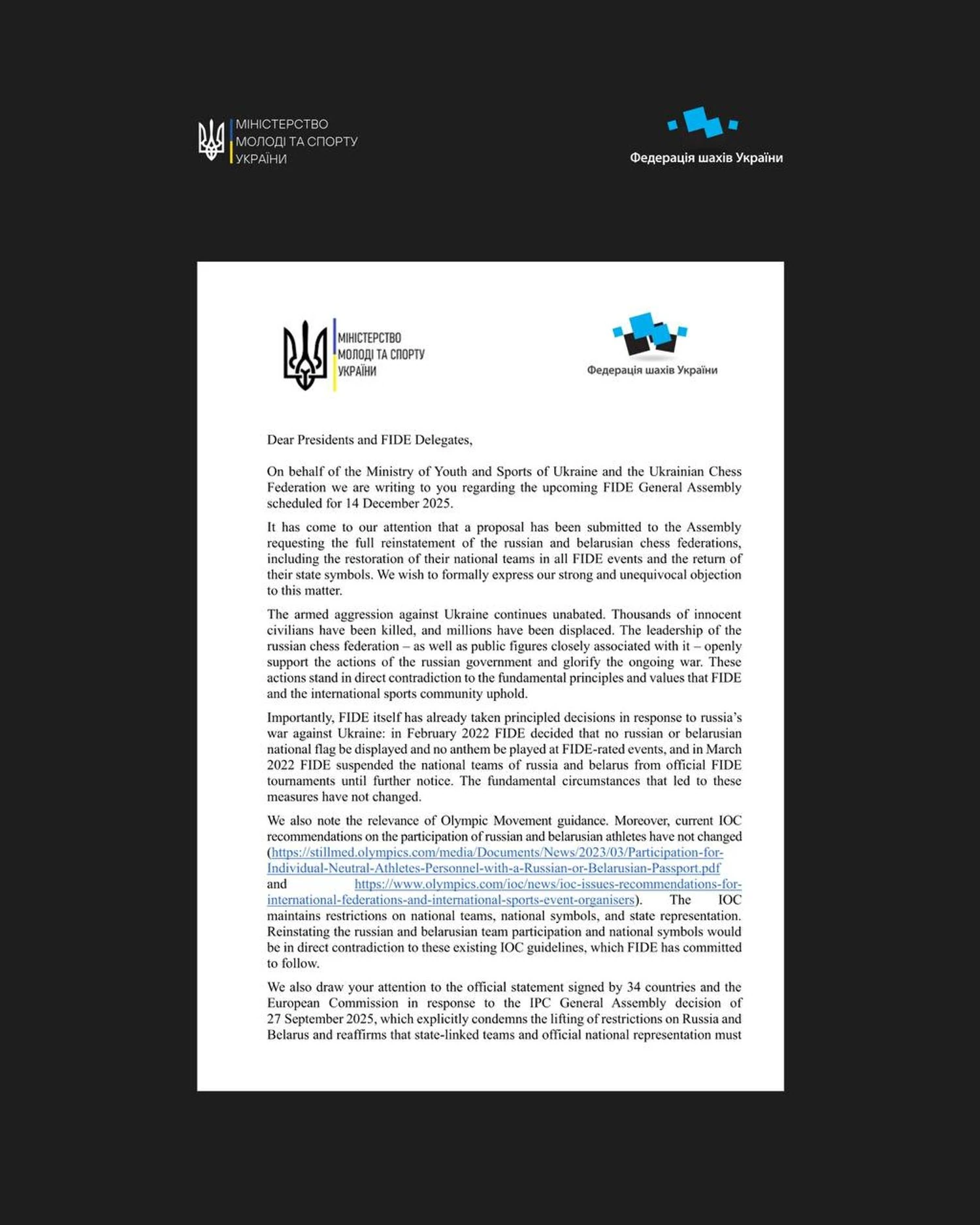 Министерство молодежи и спорта Украины и Федерация шахмат Украины подчеркивают, что обстоятельства, послужившие основанием для этих решений, остаются неизменными, а потому призывают ФИДЕ сохранить последовательную позицию и не пересматривать действующие ограничения.