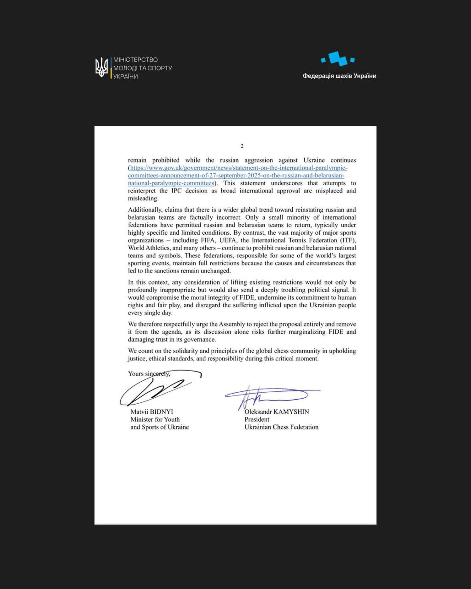 Обращение, подписанное Министром молодежи и спорта Украины Матвеем Бидным и президентом Федерации шахмат Украины Александром Камышиным.