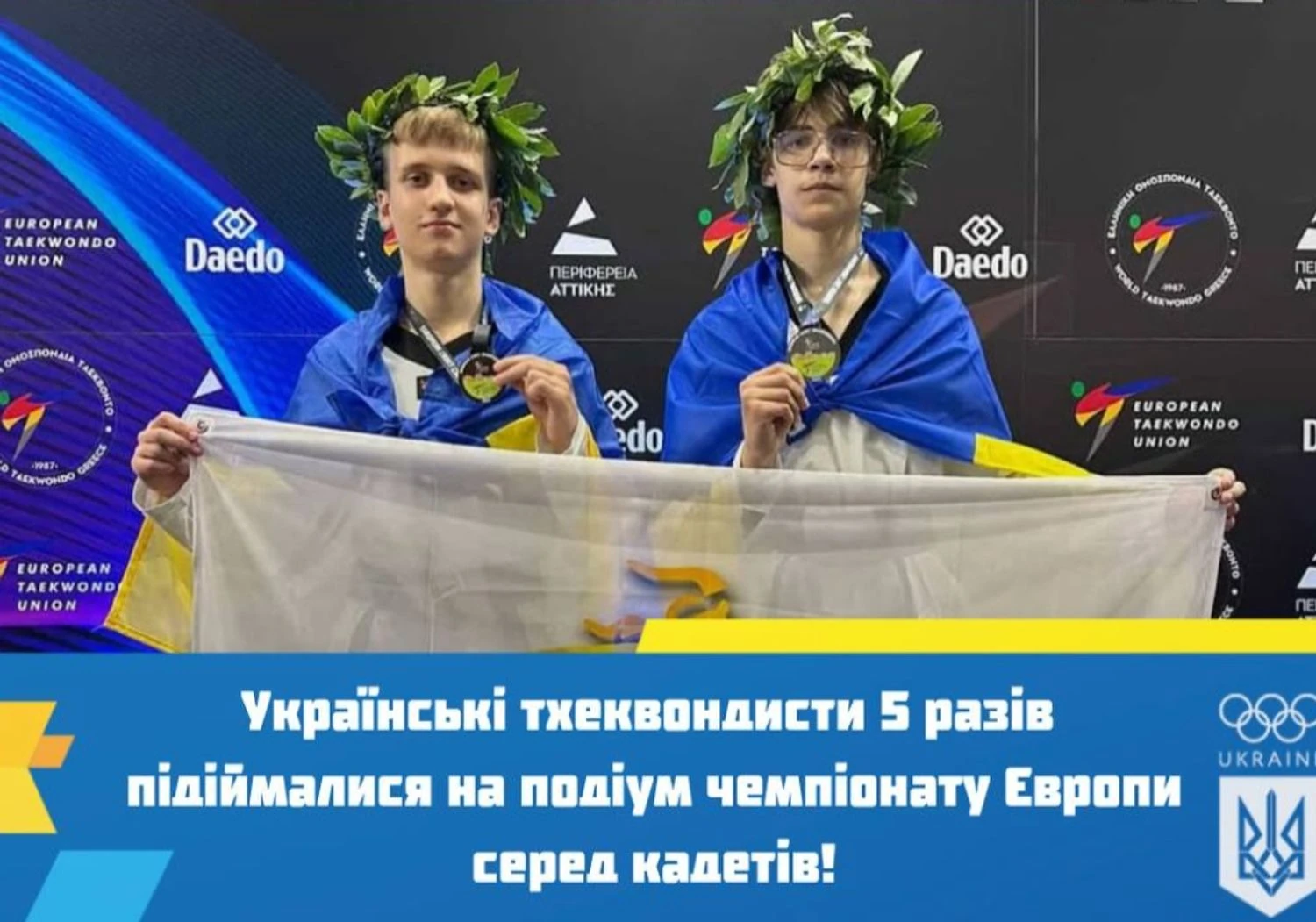 Украинские кадеты завоевали 5 наград, включая золотую, серебряную и бронзовые медали, на Чемпионате Европы по тхэквондо в Афинах. В соревнованиях принимали участие более 500 спортсменов из 35 стран.