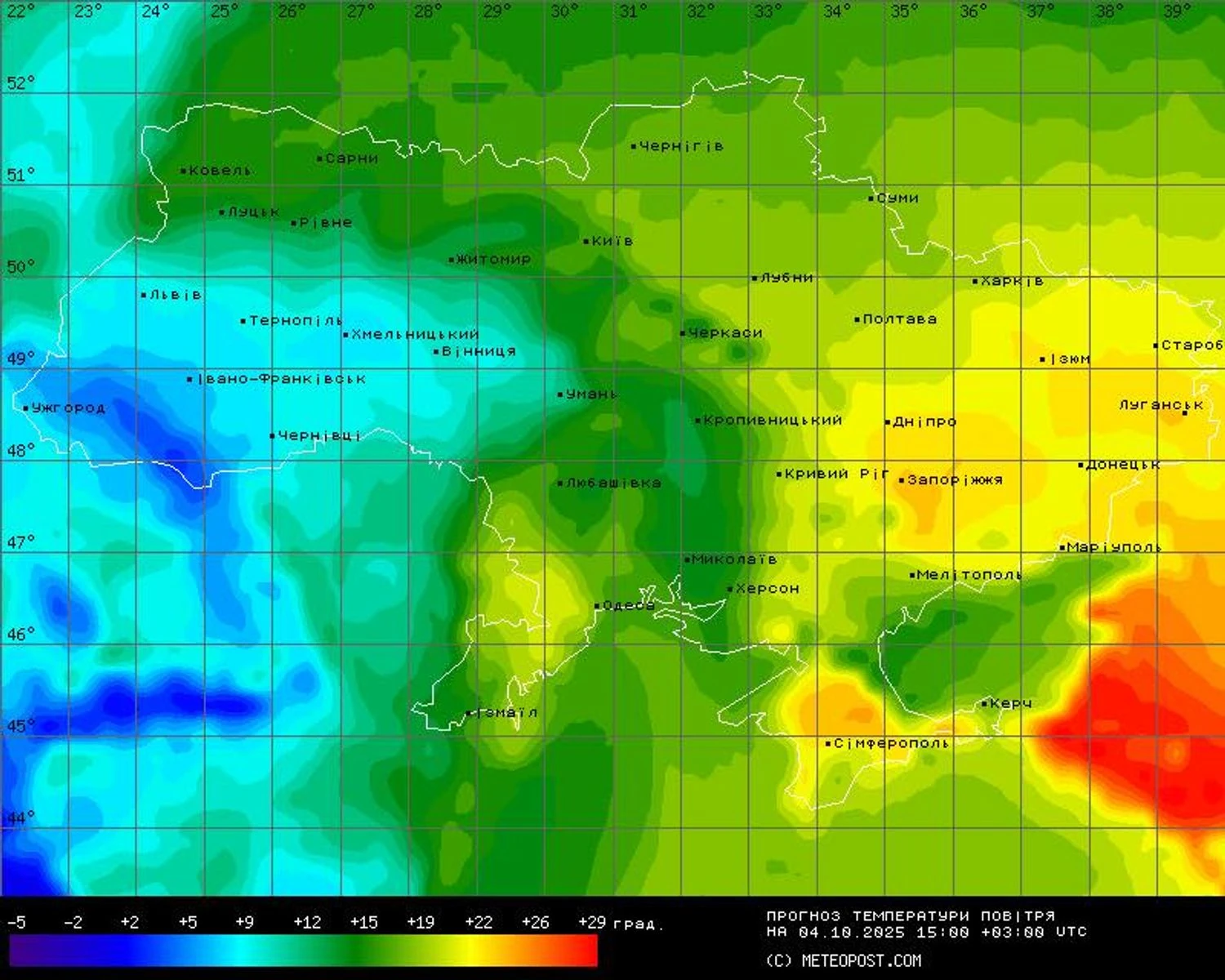 В западных областях в пределах +9+12 градусов; в северных областях +12+14 градусов; в центре Украины +12+18 градусов; на юге +15+19, в Крыму до +20 градусов; на востоке +15+18 градусов.