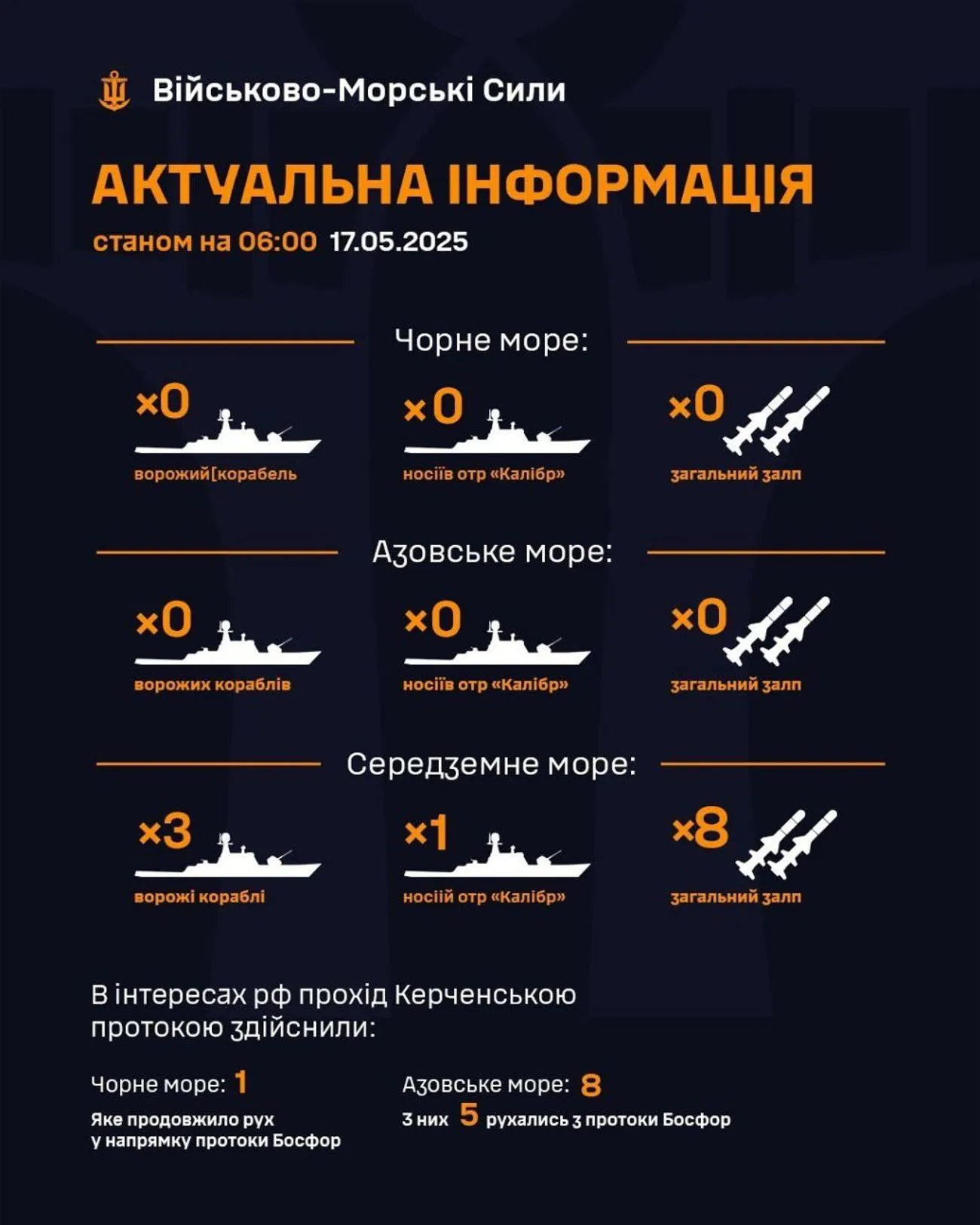По состоянию на 17 июня в Черном и Азовском морях не зафиксировано вражеских кораблей. В Средиземном море находятся три вражеских корабля, один из которых является носителем крылатых ракет.
