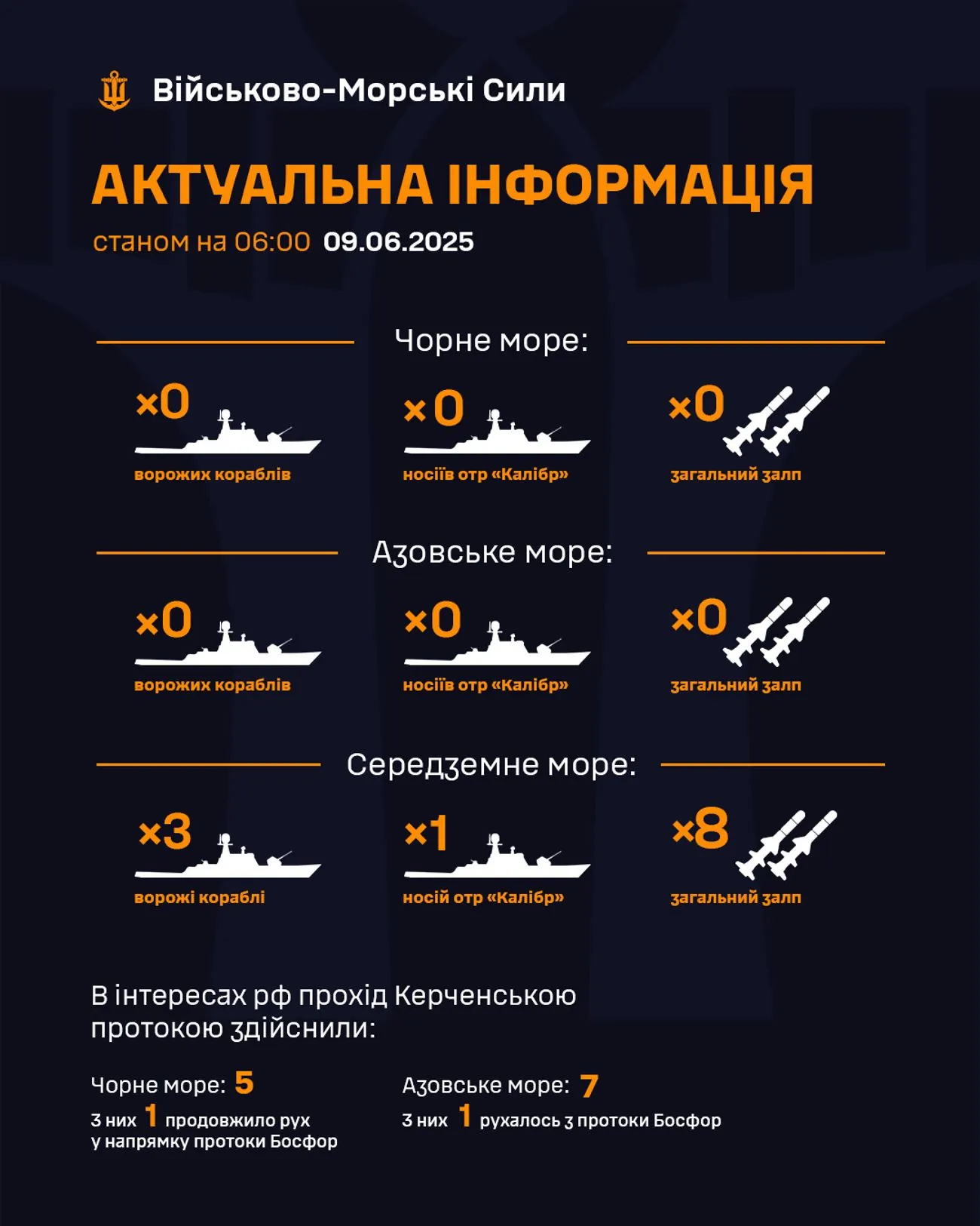 9 июня в Черном и Азовском морях не зафиксировано вражеских кораблей. В Средиземном море 3 вражеских корабля, один из которых является носителем крылатых ракет «Калибр».