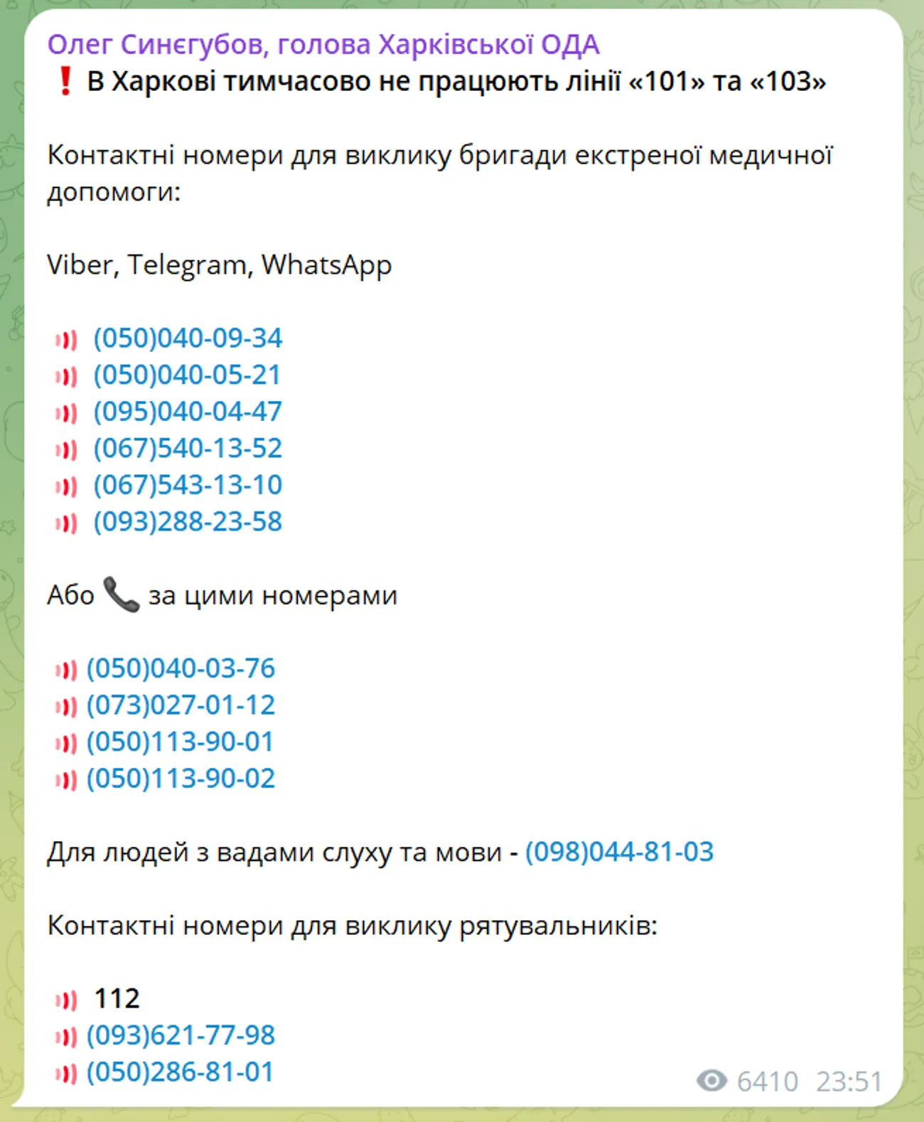 В Харькове временно стали недоступны линии "101" и "103", причины неизвестны. Глава ОВА Олег Синегубов предоставил контактные номера для вызова экстренной медицинской помощи.
