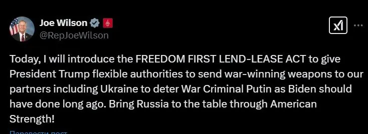 В Конгрессе США зарегистрирован законопроект FREEDOM FIRST LEND-LEASE ACT для предоставления оборонной помощи Украине. Республиканец Джо Уилсон инициировал документ, расширяющий полномочия президента по передаче вооружения.