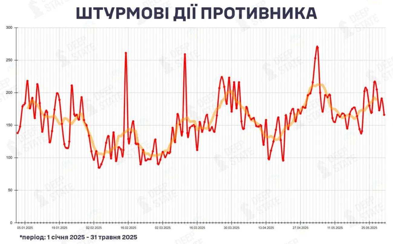 В мае 2025 года российские войска увеличили количество наступательных действий на 19%. Самым тяжелым днем было 4 мая, когда враг совершил 269 штурмов.