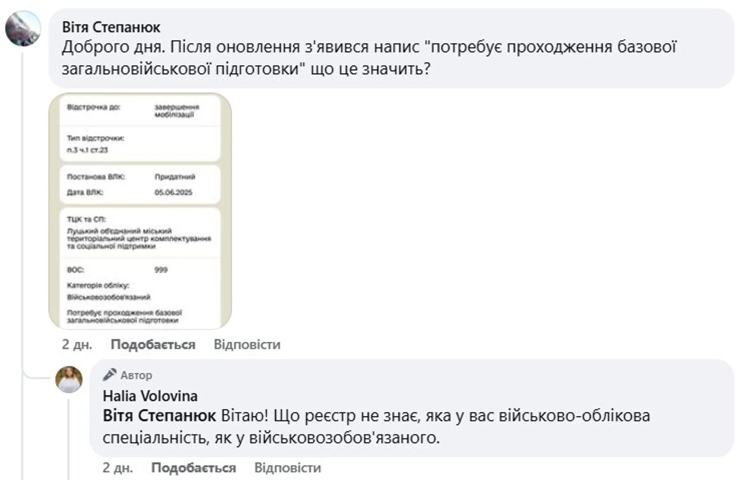 Отвечая на вопросы пользователей Facebook "Что означает этот статус?", Воловина уточнила: это обозначение появляется, когда в реестре отсутствует информация о военной специальности человека. Если другая специальность не подтверждена, необходимо пройти базовый курс подготовки.