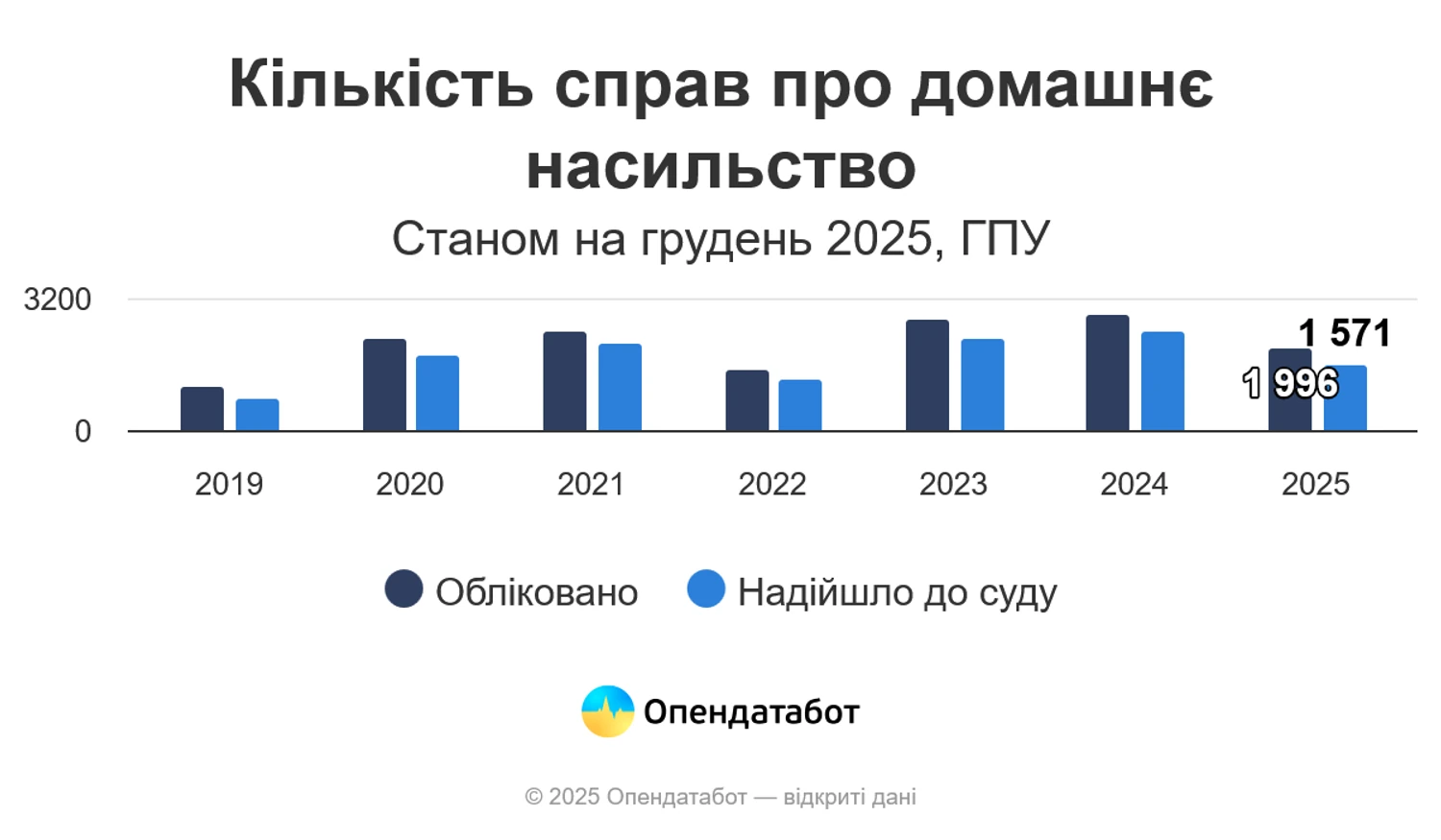 В 2025 году Генеральная прокуратура Украины открыла 1 996 тыс. уголовных производств по статье о домашнем насилии. Отмечается, что с начала полномасштабного вторжения количество производств уменьшилось на 28%. Известно, что ежемесячно фиксируется 180 дел по домашнему насилию. Присутствует тенденция, что количество запросов увеличивается именно накануне новогодних праздников, поэтому в январе этого года было открыто 274 производства.