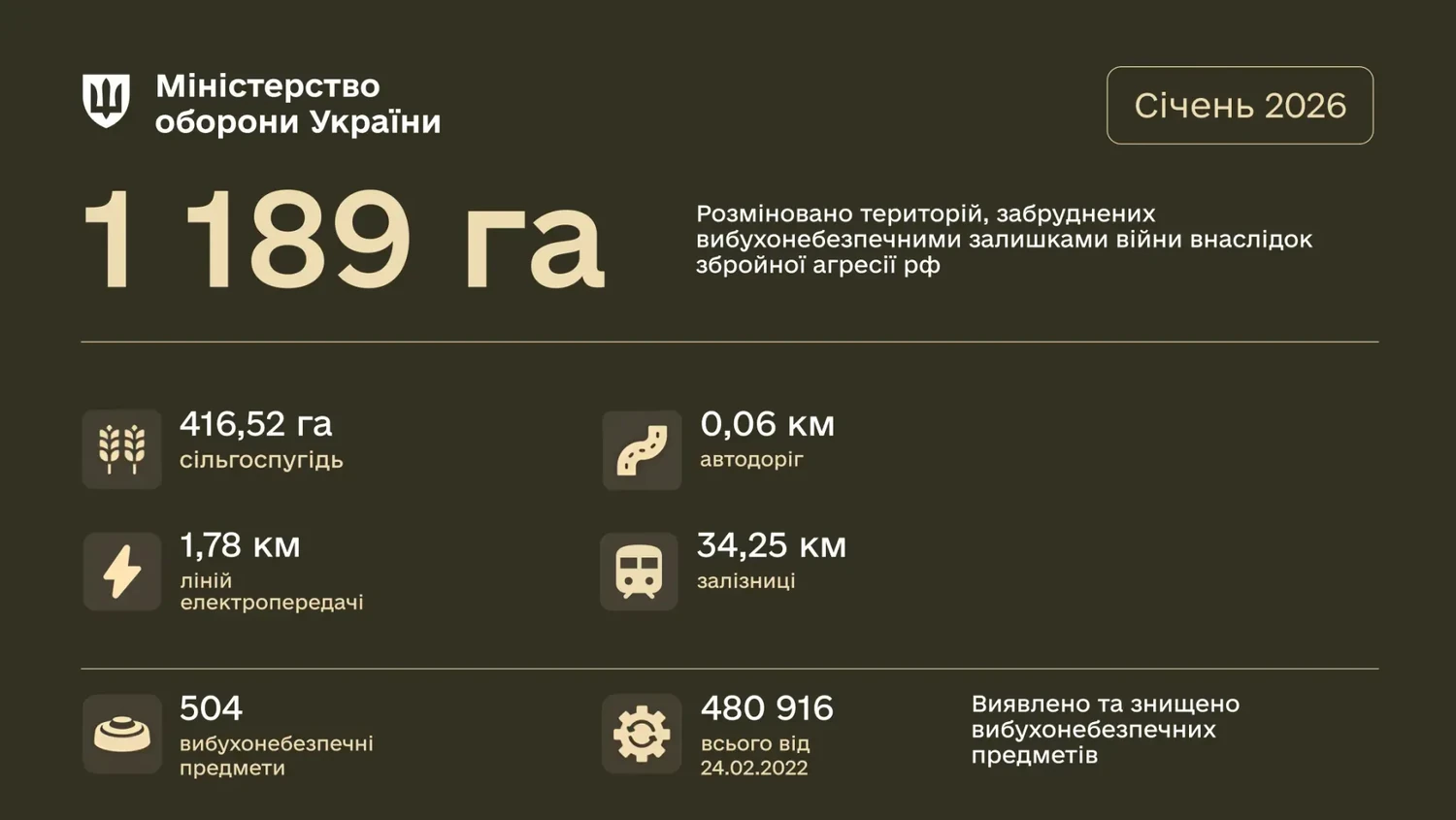 В январе 2026 года подразделения Минобороны Украины разминировали 1189 га территорий, освобожденных от оккупантов. Уничтожено 504 взрывоопасных предмета, восстановлена безопасность сельхозугодий, дорог, линий электропередачи и железной дороги.