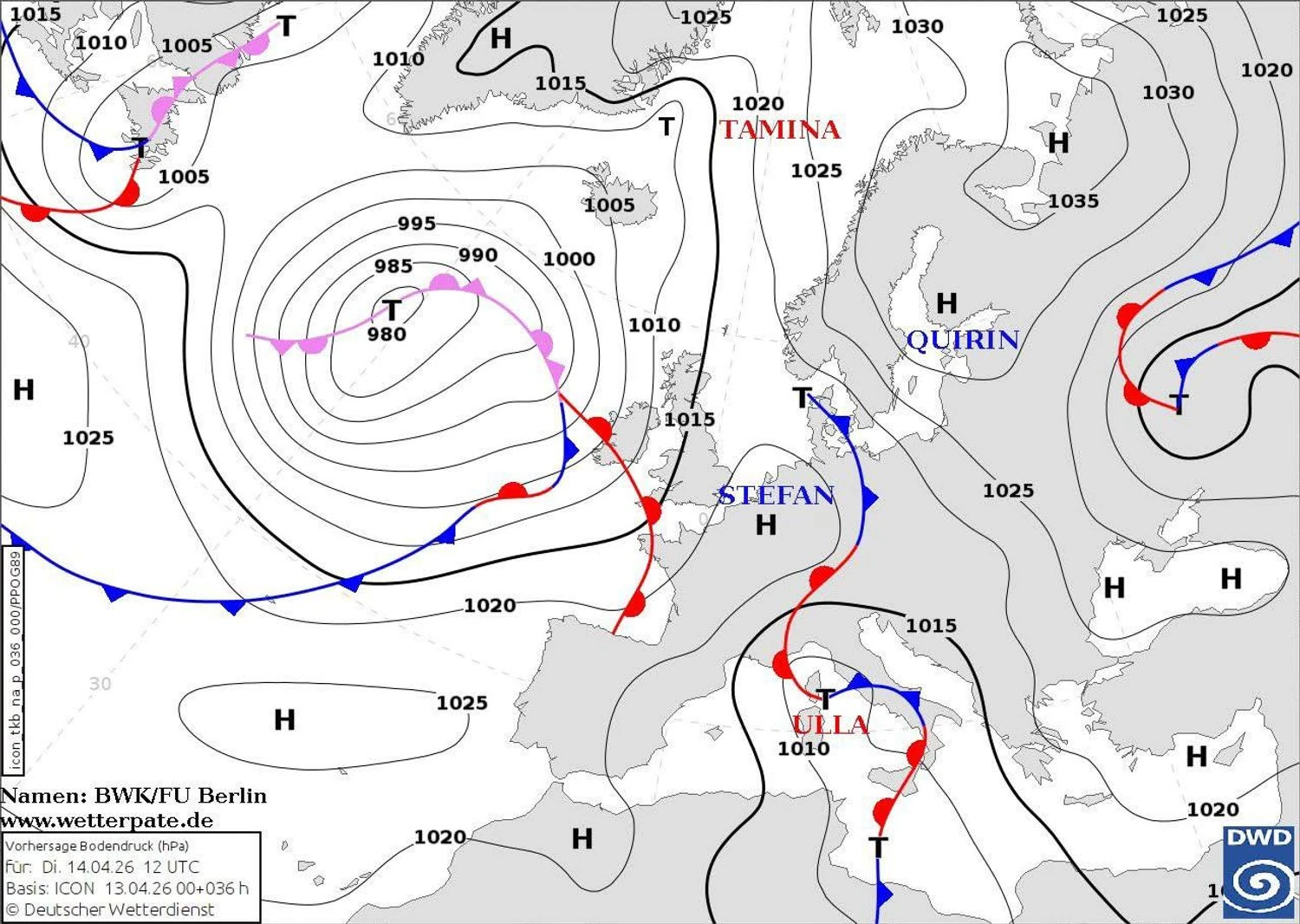 15 апреля в Украине: к западу от нас - атмосферные фронты, к востоку - циклон с атмосферными фронтами. А мы завтра уютно разместимся в гребне финского антициклона Quirin