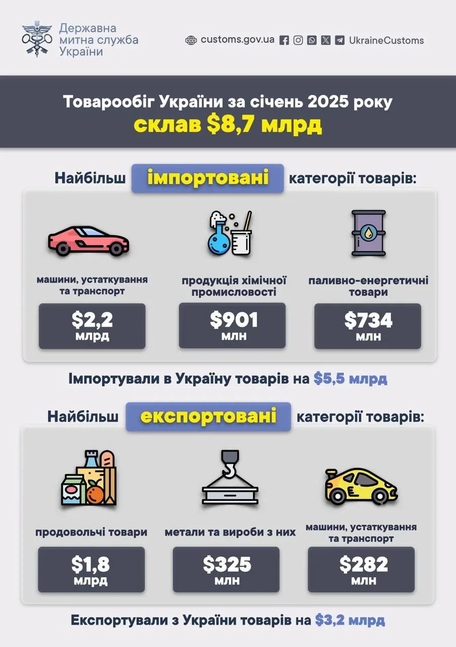 За январь 2025 года товарооборот Украины достиг $8,7 млрд. В течение января 2025 года в Украину импортировали товаров на сумму $5,5 млрд, а экспортировали - на $3,2 млрд. Облагаемый импорт составил $4,1 млрд, или 74% от общих объемов.