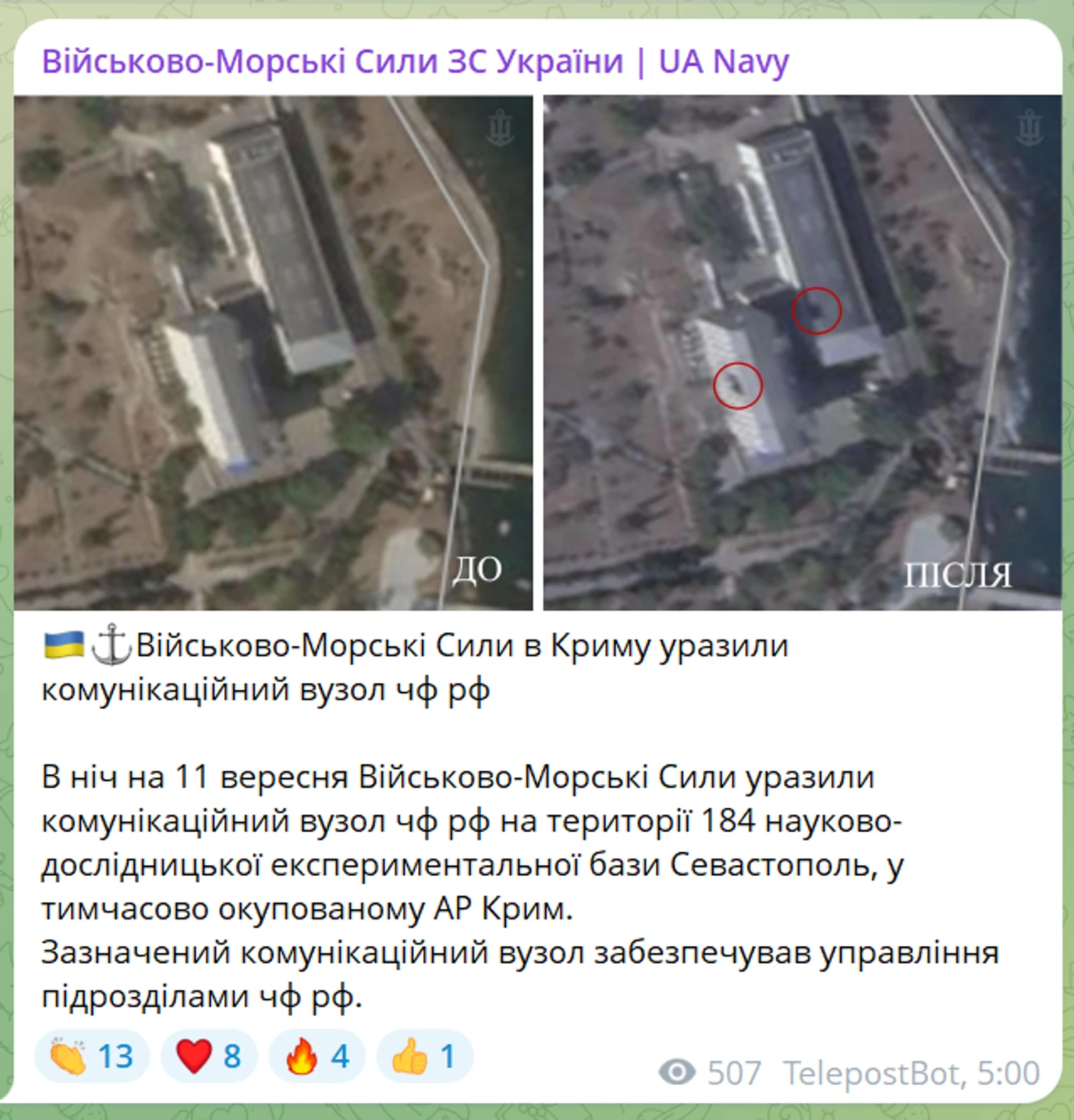 Отмечается, что в ночь на 11 сентября (ВМС) поразили коммуникационный узел ЧФ РФ на территории 184 научно-исследовательской экспериментальной базы Севастополь, во временно оккупированном АР Крым.