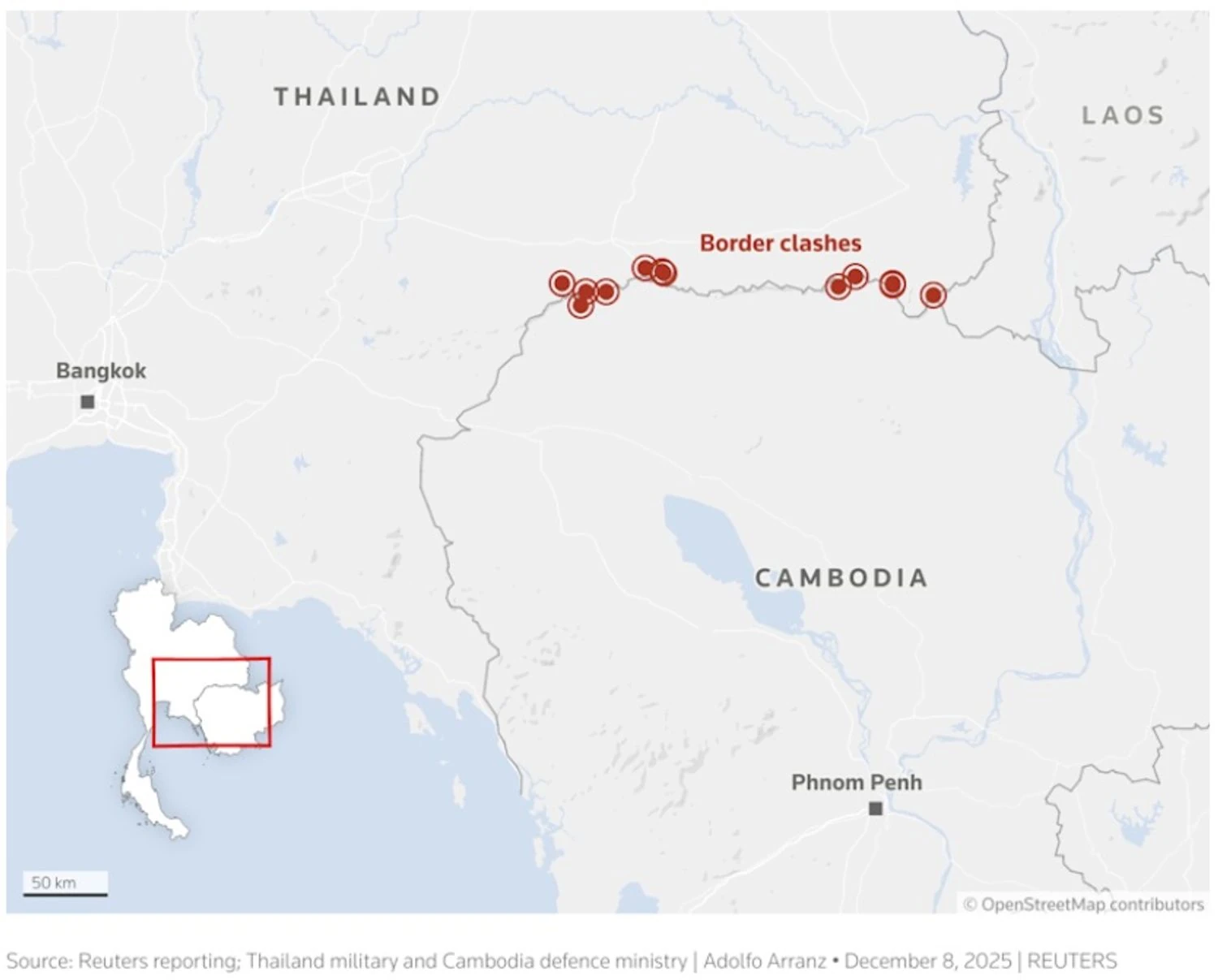 Между Таиландом и Камбоджей снова вспыхнули боевые действия, сорвав перемирие. Таиланд нанес авиаудары по Камбодже, обвиняя ее в мобилизации тяжелого вооружения, тогда как Камбоджа назвала эти действия агрессией.