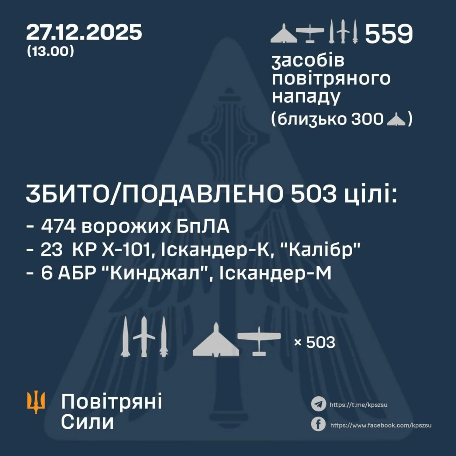 В течение ночи 27 декабря силы ПВО сбили 503 из 559 воздушных целей, выпущенных по критической инфраструктуре, преимущественно Киевщине. Зафиксированы попадания 10 ракет и 25 дронов, что привело к повреждениям на 30 локациях.