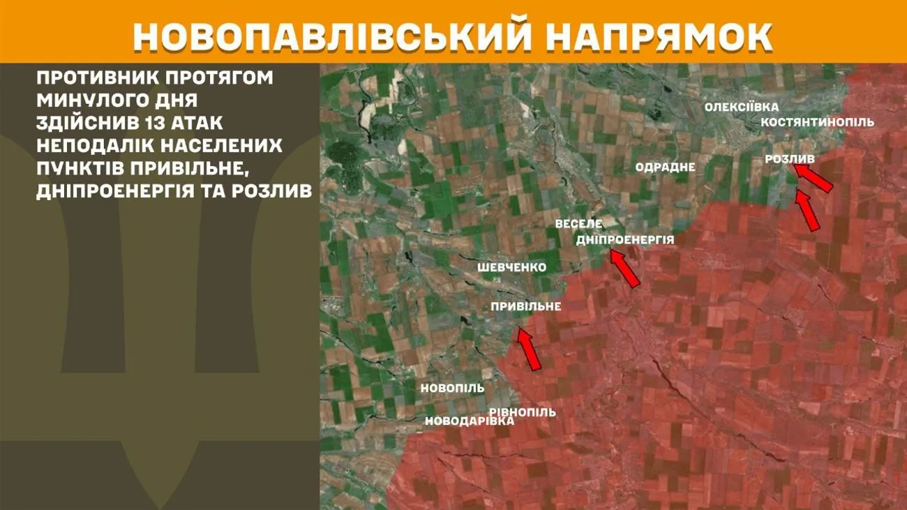 На Новопавловском направлении противник в течение прошлого дня совершил 13 атак неподалеку населенных пунктов Привольное, Днепроэнергия и Разлив.