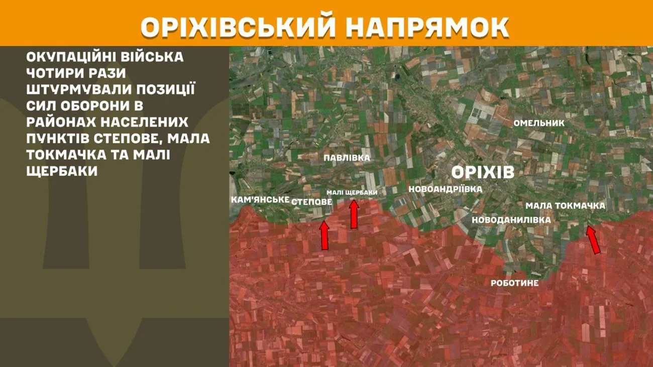 На Ореховском направлении оккупационные войска четыре раза штурмовали позиции Сил обороны в районах населенных пунктов Степное, Малая Токмачка и Малые Щербаки.