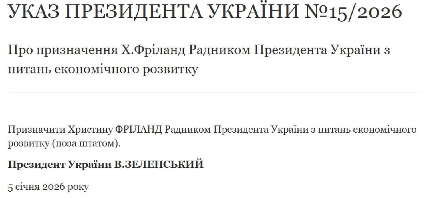 В то же время в тексте указа говорится о назначении Фриланд на должность внештатного советника Президента Украины по вопросам экономического развития.