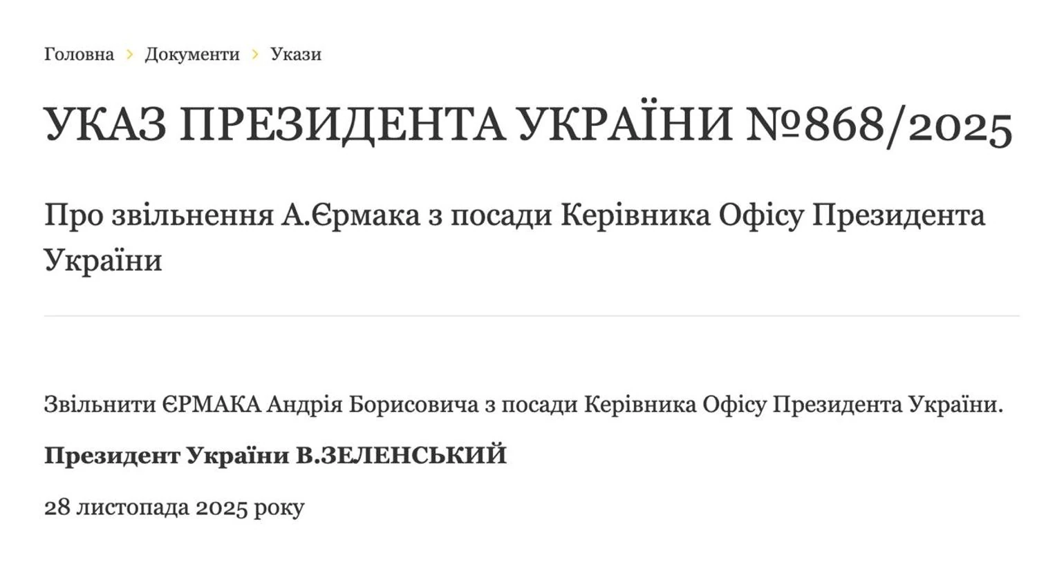 Президент Владимир Зеленский подписал указ №868/2025 об увольнении Андрея Ермака с должности Главы Офиса президента. Соответствующее решение опубликовано на сайте интернет-представительства главы государства.