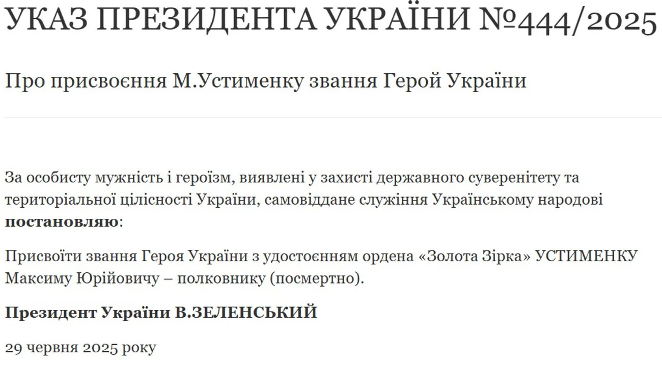 Владимир Зеленский присвоил звание Герой Украины посмертно пилоту Максиму Устименко. Соответствующий указ опубликован на сайте Президента.